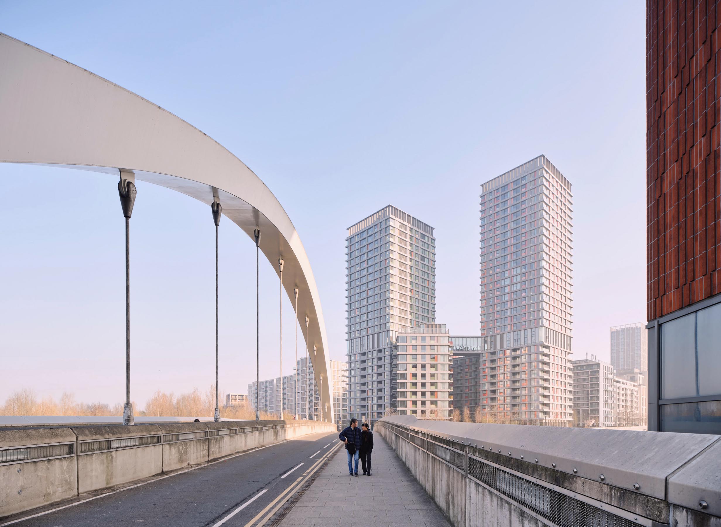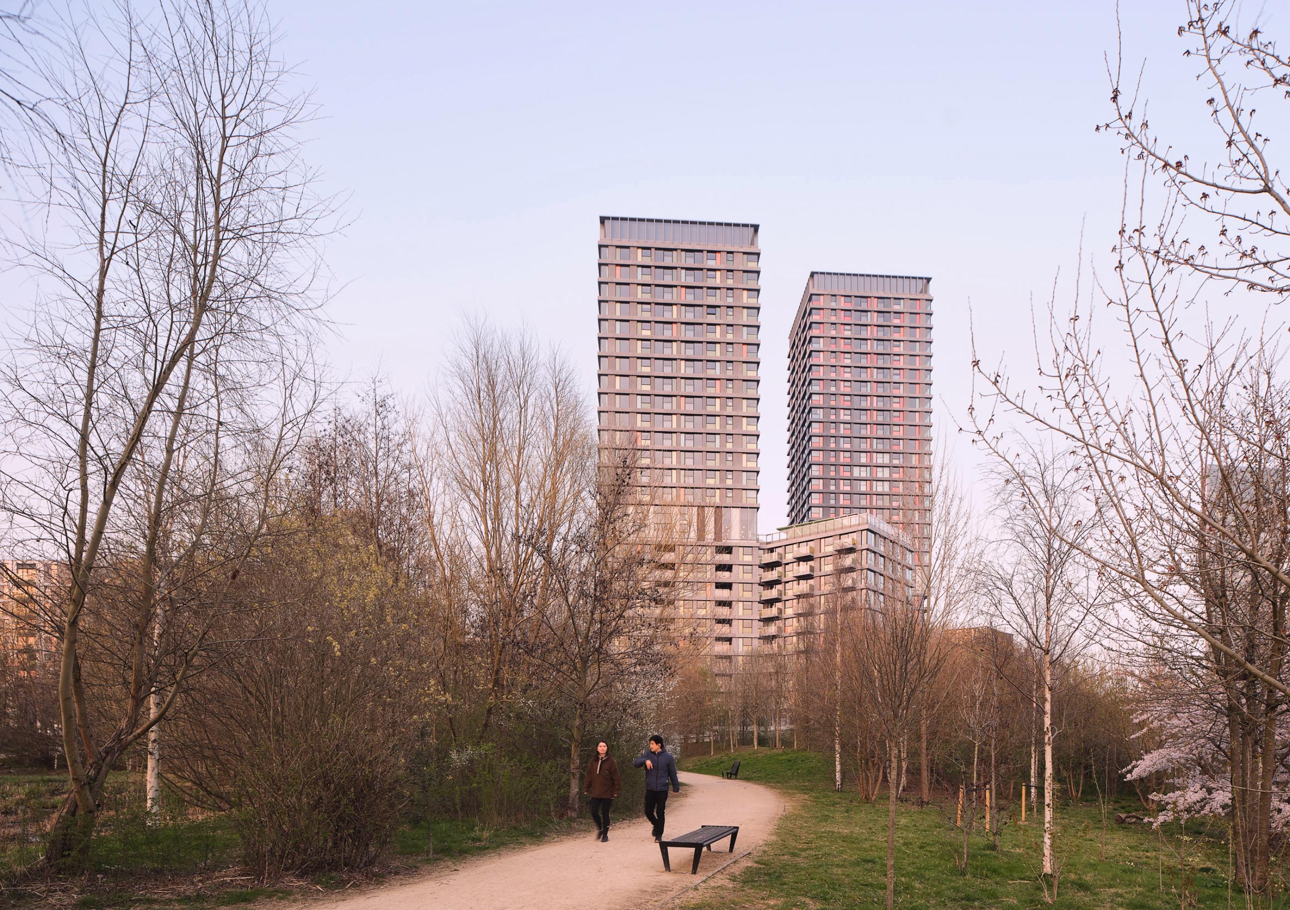 Located on Plot 6 within the former 2012 Olympic Athletes Village, in Stratford, East London, the scheme consists of two towers of 26 and 31 storeys, linked by a double-height “Skybridge”, and both connect to two lower blocks of 10 storeys.